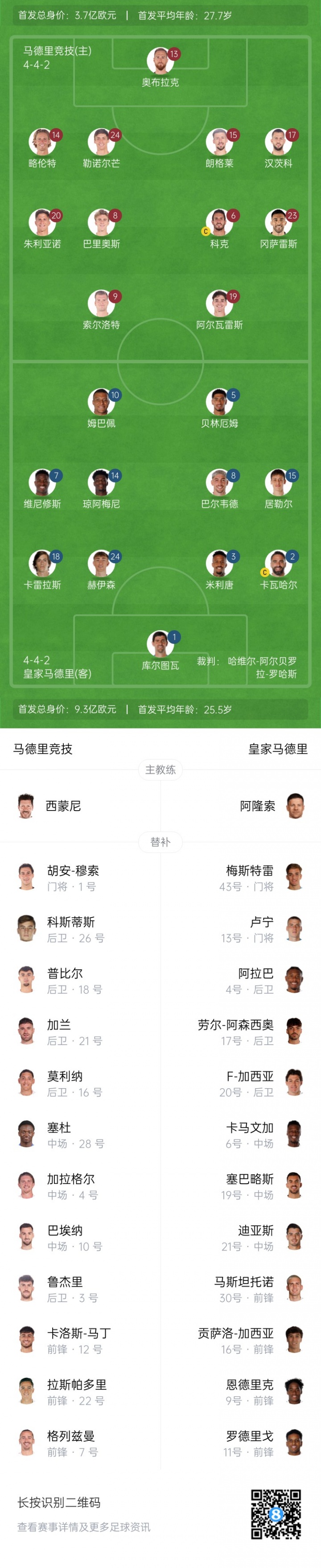 马竞替补:1-穆索、3-马特奥-鲁杰里、16-莫利纳、18-普比尔、26-科斯蒂斯、28-陶菲克·赛义杜、21-哈维-加兰、4-加拉格尔、7-格列兹曼、10-巴埃纳、22-拉斯帕多里、23-卡洛斯-马丁