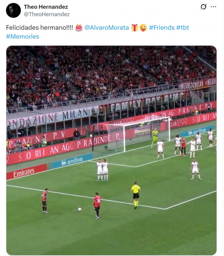特奥社媒晒出效力米兰期间助攻莫拉塔头球破门的视频,英超直播配文:“生日快乐,兄弟!”