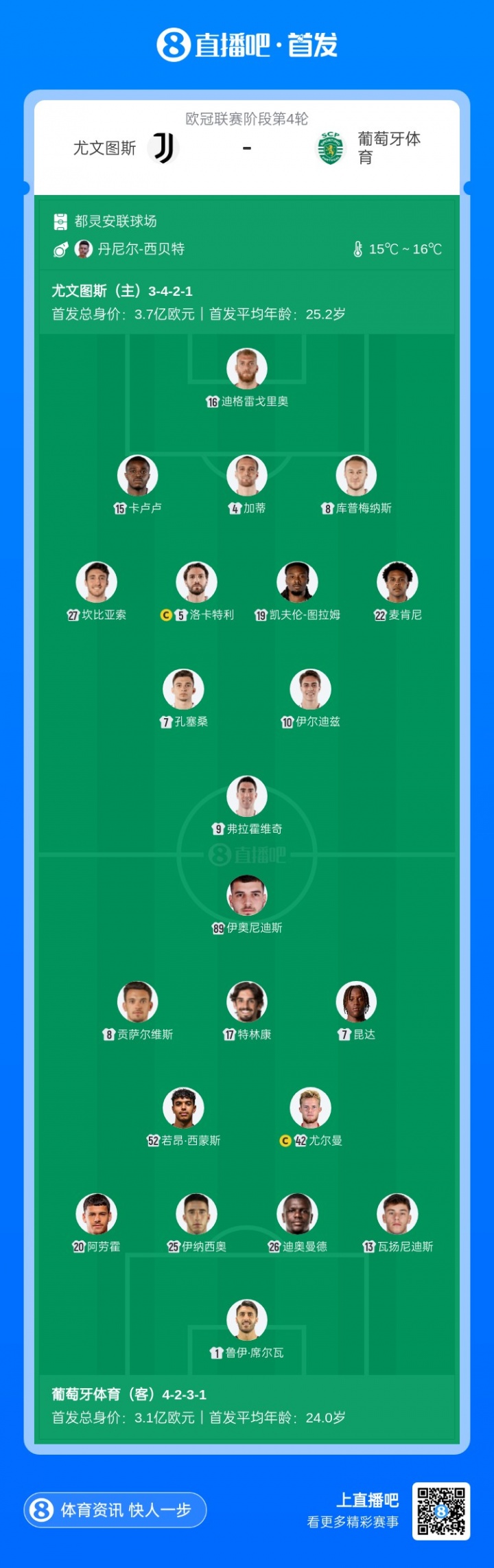 11月5日讯 北京时间11月5日凌晨4:00,欧冠第4轮,尤文图斯vs葡萄牙体育。赛前双方公布了首发名单。