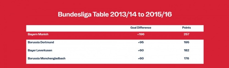 瓜迪奥拉执教拜仁期间的执教场次、胜率,以及他在13/14赛季至15/16赛季率领拜仁在德甲取得的净胜球数与积分
