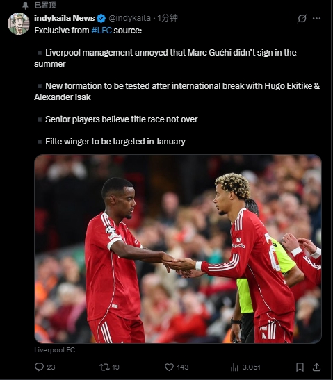 “利物浦管理层对没有在夏窗签下格伊感到恼火;国际比赛日后将测试新阵型,埃基蒂克&伊萨克;资深球员相信冠军争夺战还没有结束;精英级别边锋将在一月份成为目标。”