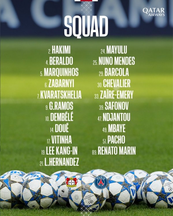 巴黎欧冠客战勒沃库森大名单:登贝莱在列,马尔基尼奥斯坐镇防线西甲联赛在线投注 10月20日讯 北京时间10月22日凌晨3:00,欧冠联赛阶段第3轮,巴黎圣日耳曼将客战勒沃库森。赛前,巴黎官方公布球队大名单,登贝莱在列。 巴黎本场比赛大名单如下:西甲联赛在线投注 门将:30-舍瓦利耶、39-萨福诺夫、89-马林 后卫:2-阿什拉夫、4-贝拉尔多、5-马尔基尼奥斯、6-扎巴尔尼、21-卢卡斯
