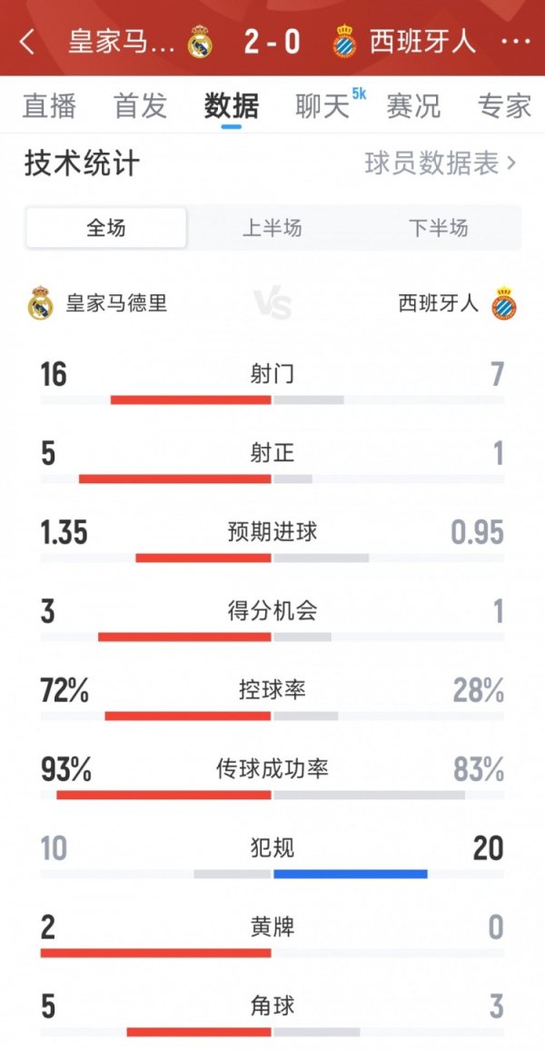 皇马2-0西班牙人全场数据:射门16-8,射正5-1,得分机会3-1足球分析高胜率技巧 9月21日讯 在本轮西甲,皇马2-0击败西班牙人,以下为双方全场数据对比: 皇马vs西班牙人 射门:16-8 射正:5-1足球分析高胜率技巧 预期进球:1.35-1.02 得分机会:3-1 控球率:72%-28% 传球成功率:93%-83% 犯规:10-20 黄牌:2-0 角球:5-3足球分析高胜率技巧