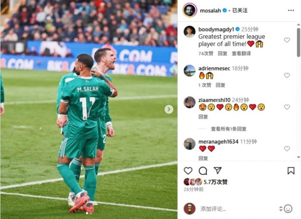 萨拉赫社媒晒赛场照,球迷评论:英超历史最佳!足球球员数据分析 9月16日讯 萨拉赫今天更新Instagram,晒出自己的赛场照。 萨拉赫没有为照片进行任何配文,但不到半小时已获得5.7万次点赞足球球员数据分析,有球迷也在评论区盛赞他为英超历史最佳。