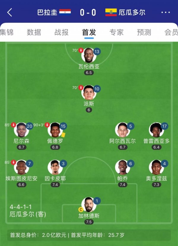 17场仅丢5球!厄瓜多尔连续4场零封0-0,下轮对抗最强火力阿根廷足球球员最新动态 09月05日讯 世预赛南美区倒数第2轮,厄瓜多尔客场0-0战平巴拉圭,连续4场比赛0-0,末轮将主场迎战最强火力、打入31球的阿根廷。 厄瓜多尔-3分起步,6月份已经提前直通世界杯,目前17场比赛仅丢5球,在南美区丢球最少。 “铁腰”凯塞多因伤缺席本场比赛,厄瓜多尔首发的后防线有刚加盟阿森纳的因卡皮耶、巴黎的帕
