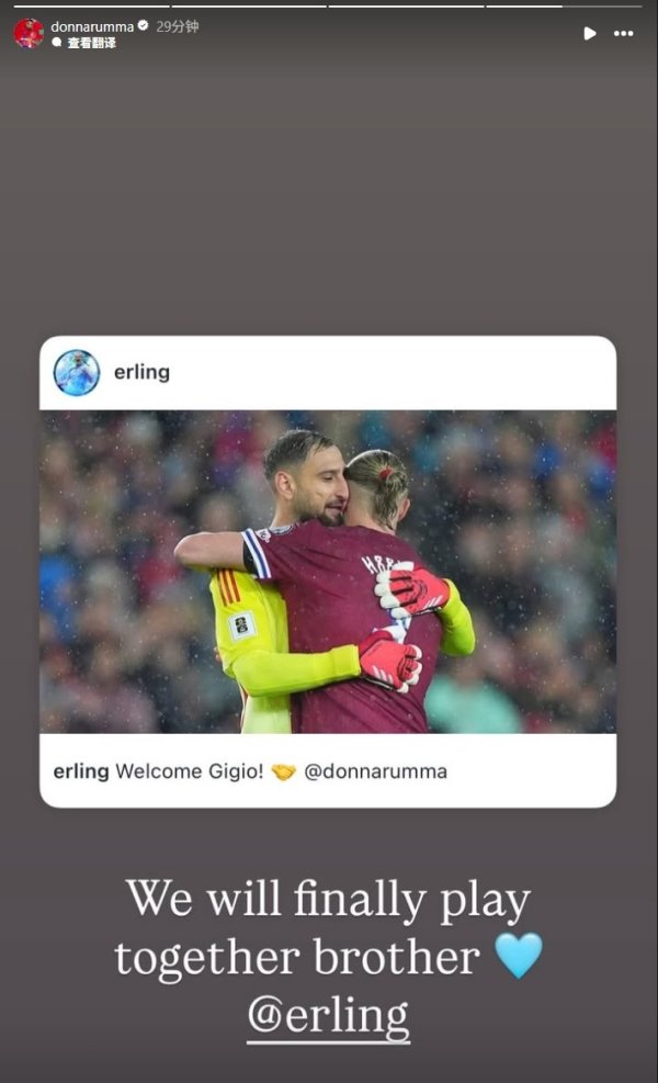多纳鲁马社媒回应哈兰德:我们终于可以一起踢球了,兄弟!足球球员身价排名 9月6日讯 多纳鲁马在Instagram发文,回应哈兰德的欢迎。 哈兰德此前在社交媒体晒出自己与多纳鲁马拥抱的照片,并配文:“欢迎你,多纳鲁马!” 多纳鲁马随后转发并写道:“我们终于可以一起踢球了足球球员身价排名,兄弟!”
