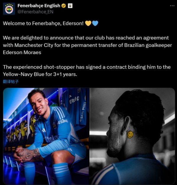 费内巴切晒埃德森官宣定妆照:欢迎加盟,我们已签下3+1合同足球俱乐部比赛集锦 9月2日讯 费内巴切俱乐部官推晒出了新援埃德森身披球衣的定妆照,并送上欢迎。 费内巴切官推表示:“欢迎来到费内巴切,埃德森!💛💙” “我们非常高兴地宣布,俱乐部已与曼城就巴西门将埃德森的永久转会达成协议。这位经验丰富的门将已与我们签署了一份3+1合同。” 此前据罗马诺报道足球俱乐部比赛集锦,转会费约1300万