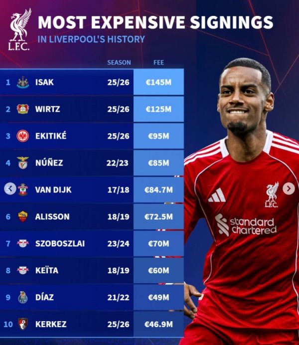 命中率极高!德转列利物浦队史引援榜:前三均为今夏新援 凯塔第8足球分析平台评价 9月2日讯 利物浦压哨签下今夏标王伊萨克,《转会市场》也统计了红军队史最贵买人情况,前三均为今夏新援。 德转列利物浦队史买人榜:欧元 1.伊萨克,25-26赛季,纽卡斯尔联,1.45亿 2.维尔茨,25-26赛季,勒沃库森,1.25亿 3.埃基蒂克,25-26赛季,法兰克福,9500万 4.努涅斯,22-23赛