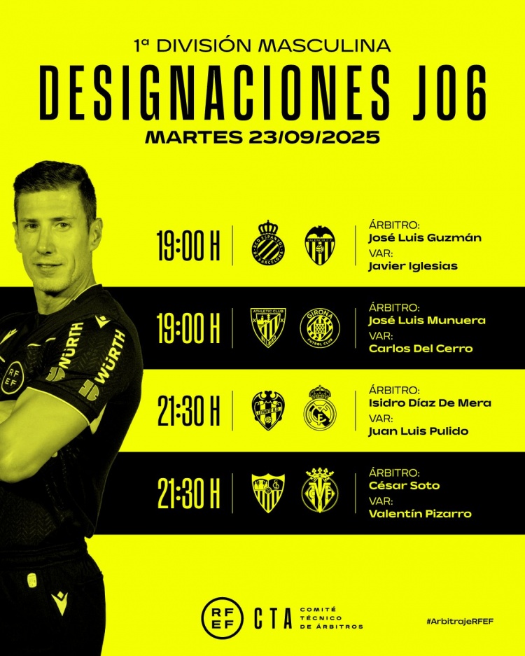 9月22日讯 西甲官方更新社媒动态,公布了9月23日进行的第6轮比赛的裁判安排。