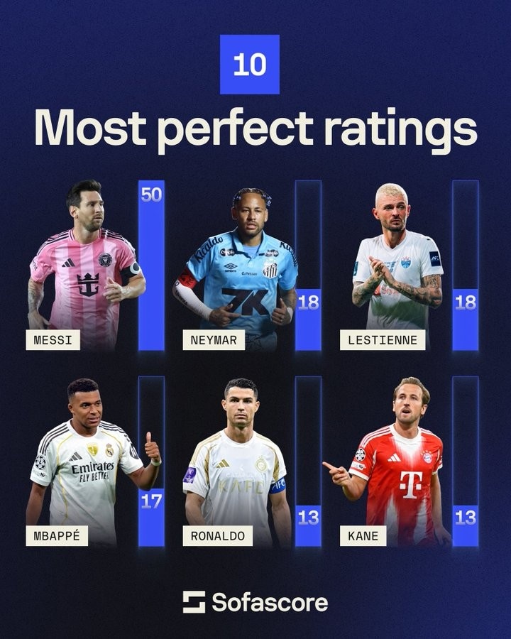 9月25日讯 SofaScore统计了他们数据库中获得10分评价的次数排名,梅西50次遥遥领跑 。