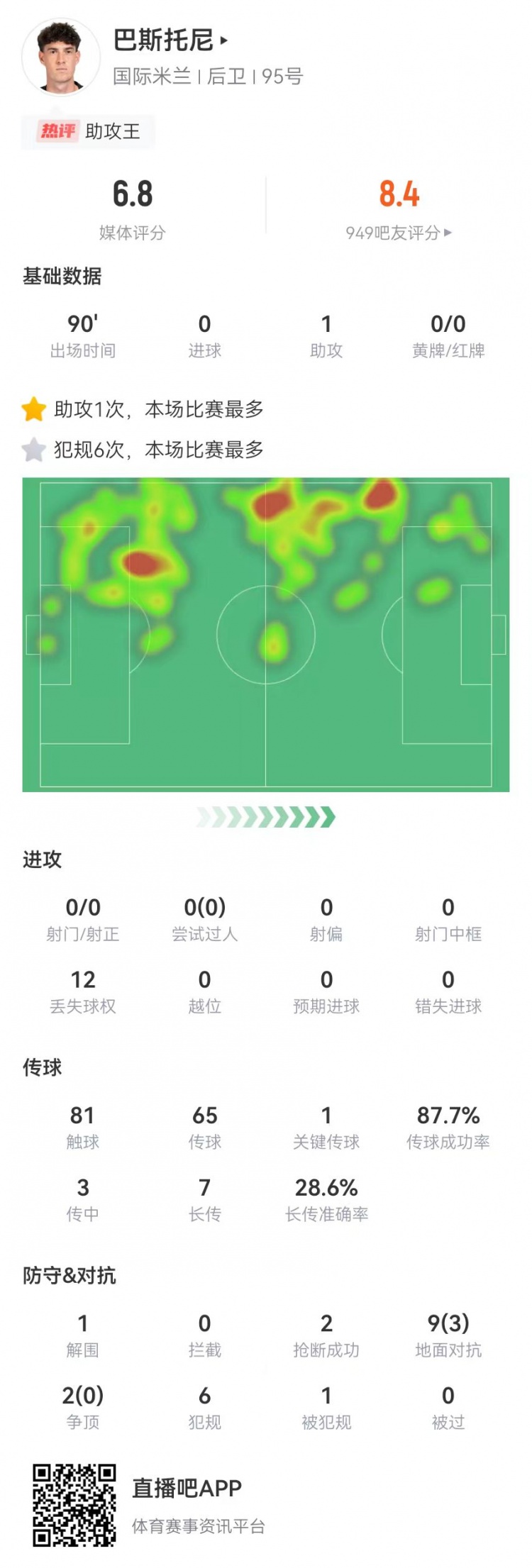 11月10日讯 国米在本轮意甲2-0力克拉齐奥,巴斯托尼本场数据如下: