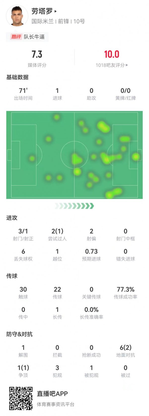 劳塔罗本场3射1正进1球+1越位 7对抗3成功+3犯规 获评7.3分足球投注实时比分 11月10日讯 国米在本轮意甲焦点战2-0力克拉齐奥,劳塔罗本场数据如下: 首发出战71分钟 1球 3射1正 2过人1成功足球投注实时比分 6丢失球权 1越位 预期进球0.73 30触球 22传球,成功率77.3% 1长传、0成功 1解围 7对抗、3成功 3犯规 1造犯规 获评7.3分足球投注实时比分