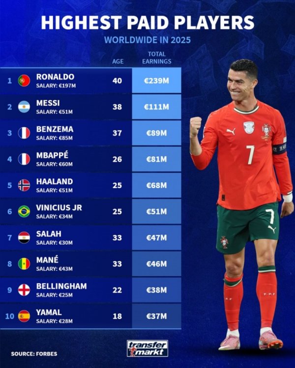 2025年球员收入排名:C罗2.39亿欧居首,梅西1.11亿欧次席足球俱乐部购票指南 10月18日讯 德国转会市场列出2025年球员收入榜单,C罗2.39亿欧居首,梅西1.11亿欧次席。 2025年球员收入排名(括号内为工资) C罗(葡萄牙,1.97亿欧)——2.39亿欧 梅西(阿根廷足球俱乐部购票指南,0.51亿欧)——1.11亿欧 本泽马(法国,0.85亿欧)——0.89亿欧 姆巴佩(法国