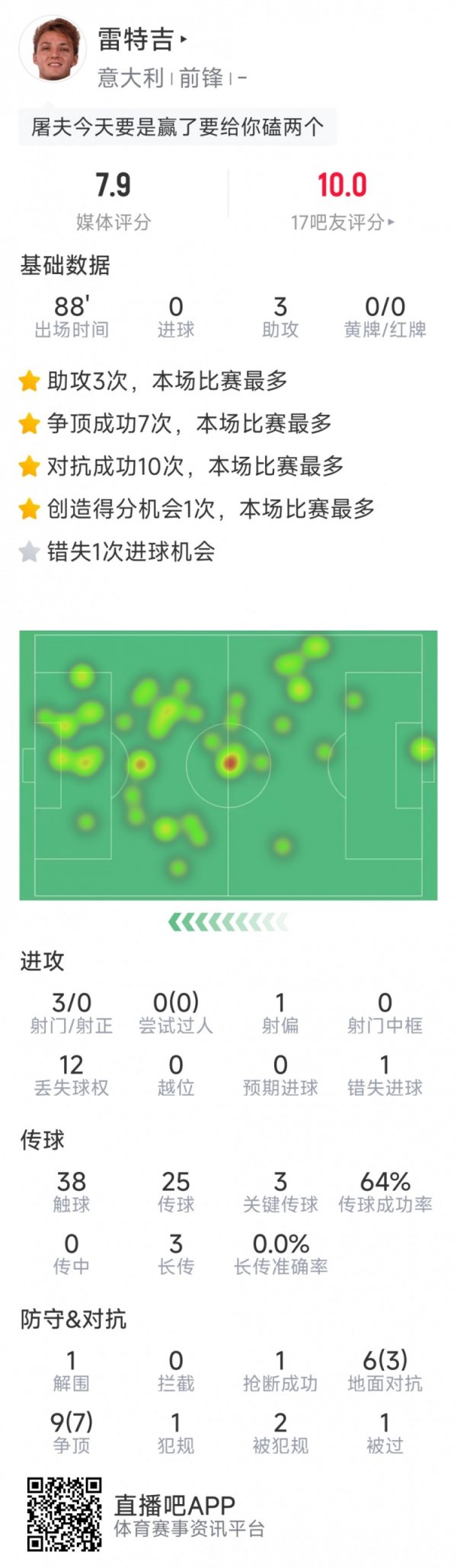 进攻核心!雷特吉本场数据:3次助攻,3射0正,3次关键传球足球球员转会传闻 9月9日讯 在本轮世预赛,意大利5-4击败以色列,雷特吉助攻帽子戏法,以下为他在本场数据: 比赛时间88分钟 3次助攻 3射0正 1次错失良机 38次触球 3次关键传球 传球成功率64% 1次解围 1次抢断 15次对抗10次成功 评分7.9分足球球员转会传闻