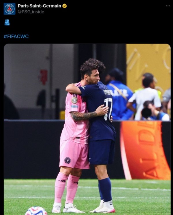 如果再见不能红着眼!巴黎官推赛后晒梅西和维蒂尼亚拥抱照6月30日讯 巴黎在世俱杯16强战4-0轻取迈阿密国际,梅西和维蒂尼亚均踢满全场。 两人在赛后也相拥寒暄,巴黎官推在赛后也晒出了两人的拥抱照并配上拥抱的表情符号。 梅西在效力巴黎两年期间,维蒂尼亚还只是初出茅庐的中场球员菜鸟,曾因为频频糟糕表现而备受球迷诟病。