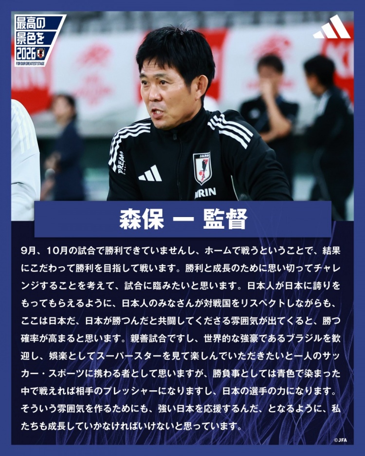 “虽然只是一场国际友情 赛,但对手巴西队是世界顶级球队。我们欢迎他们的到来,不过赛事 事关胜负,如果我们的主场作战 被蓝色的海洋所覆盖,那也会给对手带来压力,同时成为日本队的助力。希望球迷们能够营造起氛围,为日本队提供强强劲 的支持,这也和我们的成长息息相关。”