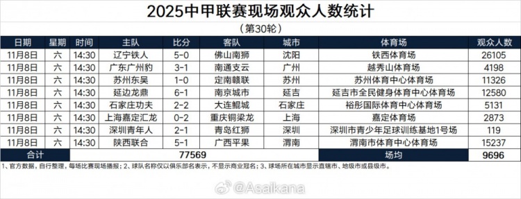 2025中甲职业联赛 现场观赛人群 人数统计(第30轮)