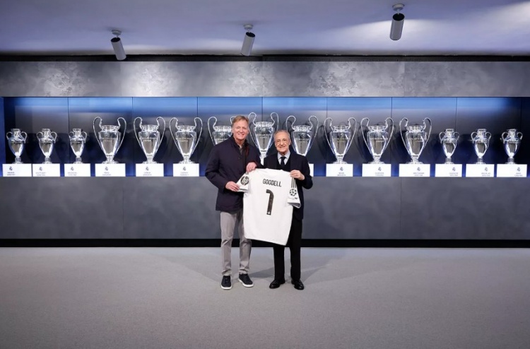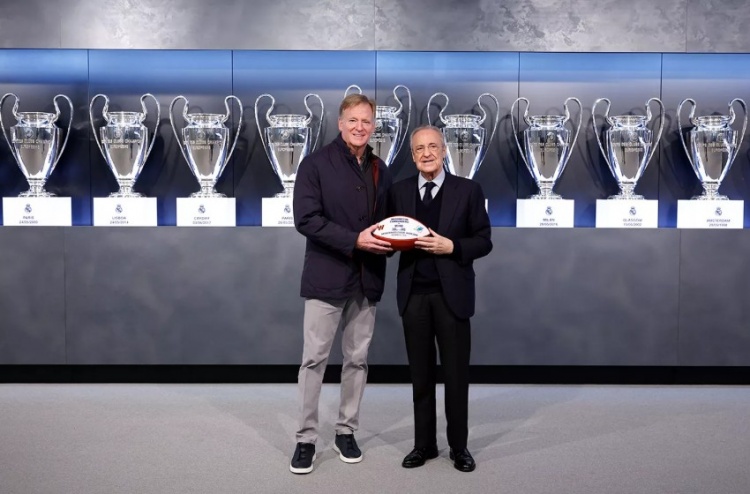 11月15日讯 皇马官方晒图,俱乐部主席弗洛伦蒂诺与NFL总裁罗杰·古德尔会面。