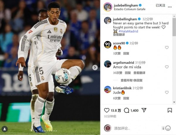 贝林社媒庆祝获胜 :在这里赛事 从来都不轻松,以3分开启新的一周10月20日讯 西甲第9轮赛事 ,贝林厄姆杆位出战,皇马客场应战 1-0击败赫塔费。 贝林厄姆社媒晒出赛事 照片,配文:“在这里赛事 从来都不轻松,但以一场苦战拿下三分,开启新的一周。”