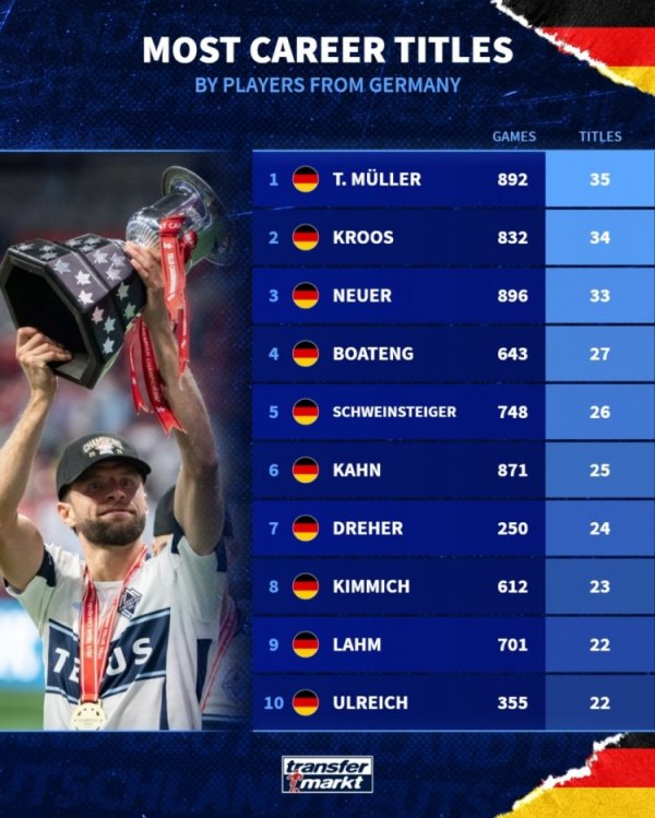 德国球员第一名 榜:穆勒35冠居首,克罗斯34冠、诺伊尔33冠10月2日讯 德国转会市场统计了德国球员的第一名 数量,并列出榜单,随温哥华白浪赢得加拿大第一名 杯第一名 的穆勒以35冠居首,克罗斯34冠次席。 德国球员第一名 数量排名: 穆勒——35冠 克罗斯——34冠 诺伊尔——33冠 博阿滕——27冠 施魏因斯泰格——26冠 卡恩——25冠 德雷赫——24冠 基米希——23冠 拉姆——