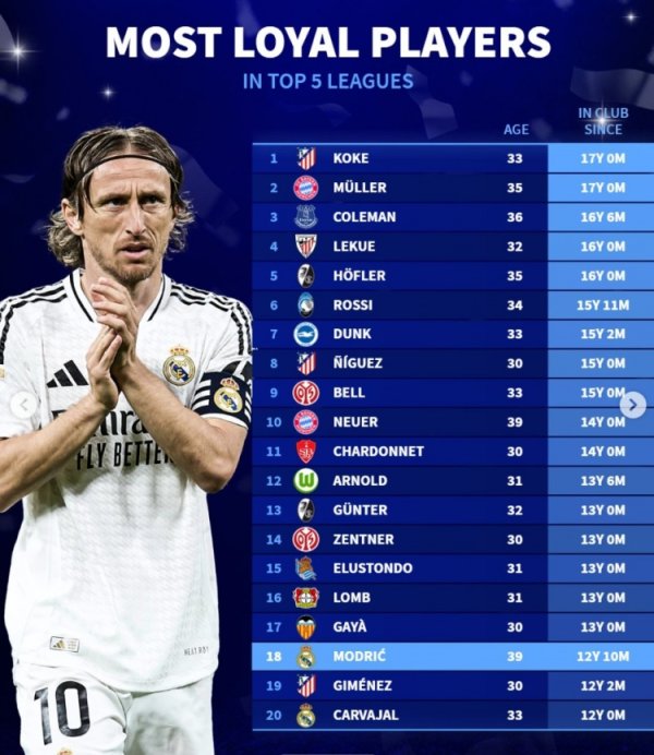 当前效力五大联赛同一队时长:科克&穆勒17年最长 魔笛12年10个月足球分析高胜率技巧 7月11日讯 皇马在世俱杯半决赛0-4惨败巴黎,莫德里奇已经完成告别战。《转会市场》也列出了当前五大联赛效力同一队时间最长球员榜,魔笛位列第18位。 德转列当前效力五大联赛同一球队时长榜: 1.科克(马德里竞技),33岁,17年0个月 2.托马斯-穆勒(拜仁慕尼黑),35岁,17年0个月 3.西莫斯-科尔曼(