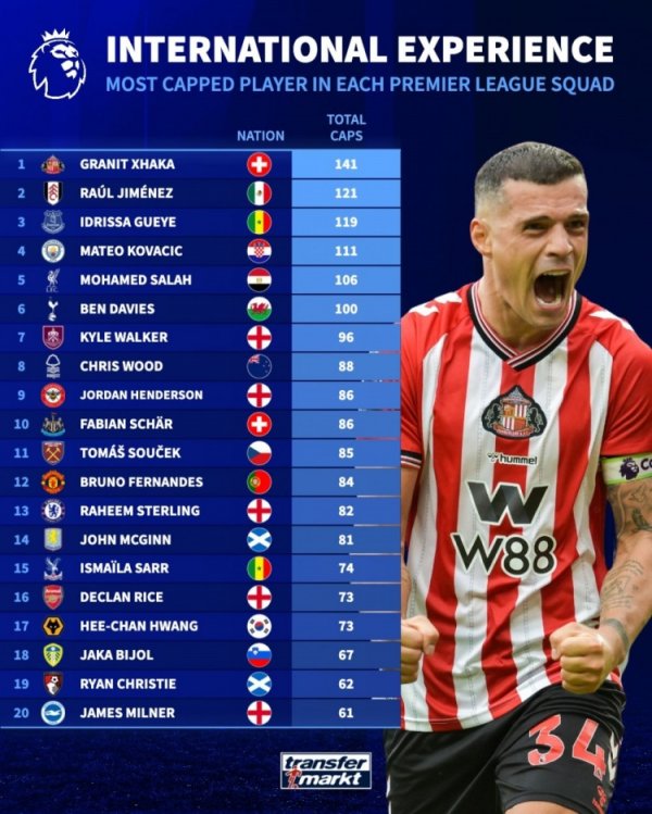 英超各队为国征战次数最多球员:扎卡141场居首,萨拉赫106场第5足球投注手机应用 11月1日讯 英超20支球队有着诸多国脚球员,德国转会市场盘点了各队为国家队出战场次最多球员,扎卡以141场居首,希门尼斯以121场位居次席。 以下为具体排名情况: 1、扎卡(瑞士,桑德兰):141场 2、希门尼斯(墨西哥,富勒姆):121场 3、盖耶(塞内加尔,埃弗顿):119场 4、科瓦契奇(克罗地亚,曼城