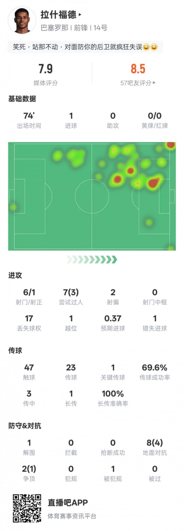拉什福德本场:1进球1关键传球3过人成功1错失进球机会,评分7.9在线足球投注优惠 11月3日讯 西甲第11轮,巴萨主场迎战埃尔切。拉什福德首发出战,贡献1粒进球,送出1次关键传球,3次过人成功,但也错失1次进球机会,评分7.9。 拉什福德本场比赛数据: 进球1 助攻0 射门6 射正1 过人7 过人成功3 射偏2 丢失球权17 错失进球机会1 触球47 传球23 关键传球1 传球成功率69.6
