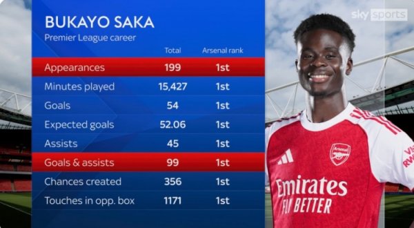 萨卡英超首秀以来出战199场、进54球、助功 45次,阿森纳队内居首10月4日讯 萨卡将迎来英超出战200场里程碑,天空体育统计了萨卡首秀以来的英超数据,他的出场次数、得分 、助功 等多项数据阿森纳队内同期居首。 萨卡首秀以来阿森纳队内居首的英超数据: 出场——199 出场时间——15427分钟 得分 ——54 预期得分 ——52.06 助功 ——45 加入 得分 ——99 创造机会——356