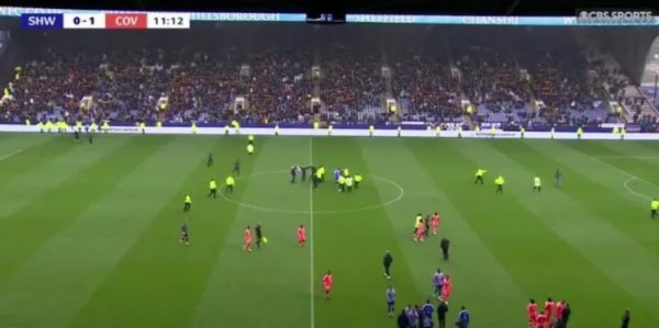 太阳报:因主队球迷冲场抗议老板,谢周三与考文垂的赛事 被迫中断10月4日讯 据《太阳报》报道,谢菲尔德星期三与考文垂的赛事 因球迷闯入运动活动 场 而中断,赛事 开始仅10分钟后,主场作战 球迷冲入运动活动 场 抗议老板钱斯里。 主裁判 中止 了赛事 约5分钟,直到安保人员将这些球迷带离场地后,赛事 才得以继续进行。谢菲尔德星期三在钱斯里的领导下陷入了困境。 球迷们曾警告称,他们将在对阵考