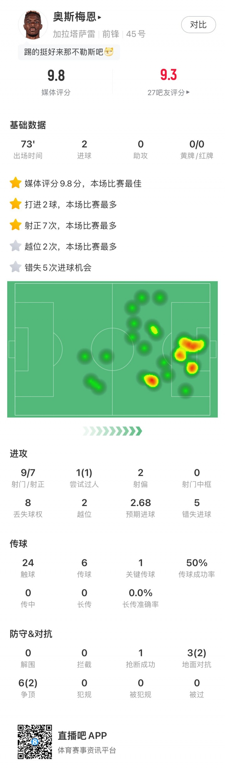 10月23日讯 欧冠职业联赛 阶段第3轮,加拉塔萨雷主场作战 3-1击败博德闪耀,奥斯梅恩双响获最有价值球员,但他本场也错失了5次良机。