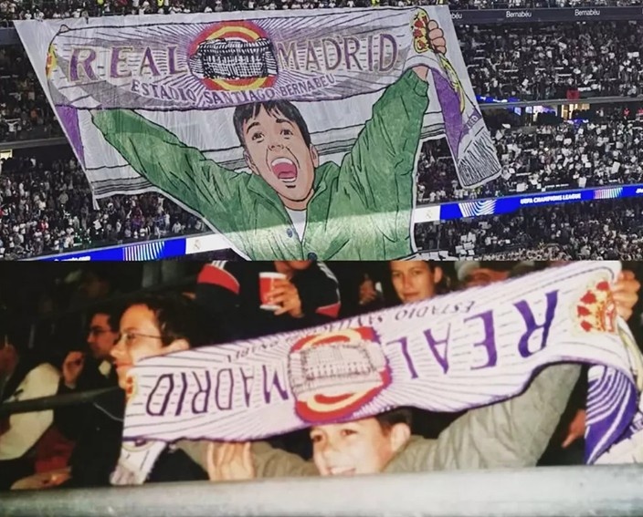 皇马主场迎战尤文图斯时看台展示的致敬TIFO,灵感源自他幼时在伯纳乌的留影
