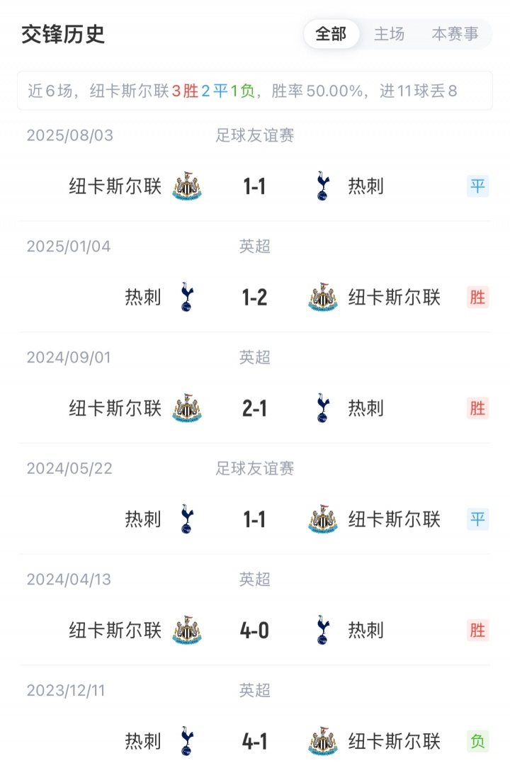 热刺联赛5胜2平2负积17分暂位英超第3,英超免费高清直播各项赛事近6场2胜;纽卡联赛3胜3平3负积12分暂位英超第12,各项赛事收获2连胜。热刺对阵纽卡已连续5场不胜(2平3负)。
