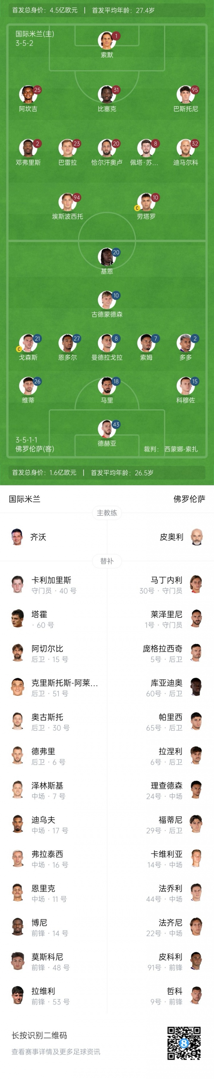 国际米兰首发:1-索默、25-阿坎吉、31-比塞克、95-巴斯托尼、32-迪马尔科、2-邓弗里斯、23-巴雷拉、20-恰尔汗奥卢、8-苏契奇、94-埃斯波西托、10-劳塔罗