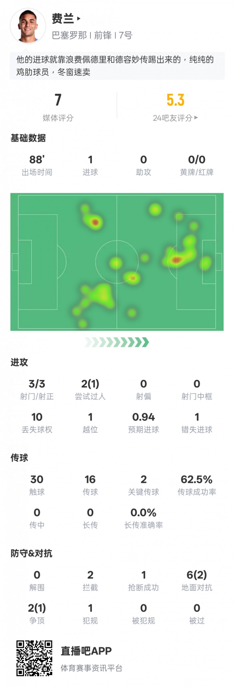 11月3日讯 西甲第11轮,巴萨主场迎战埃尔切,费兰-托雷斯首发出战,贡献1粒进球,英超免费高清直播送出2次关键传球,1次过人成功,1次错失进球机会,评分7.0。