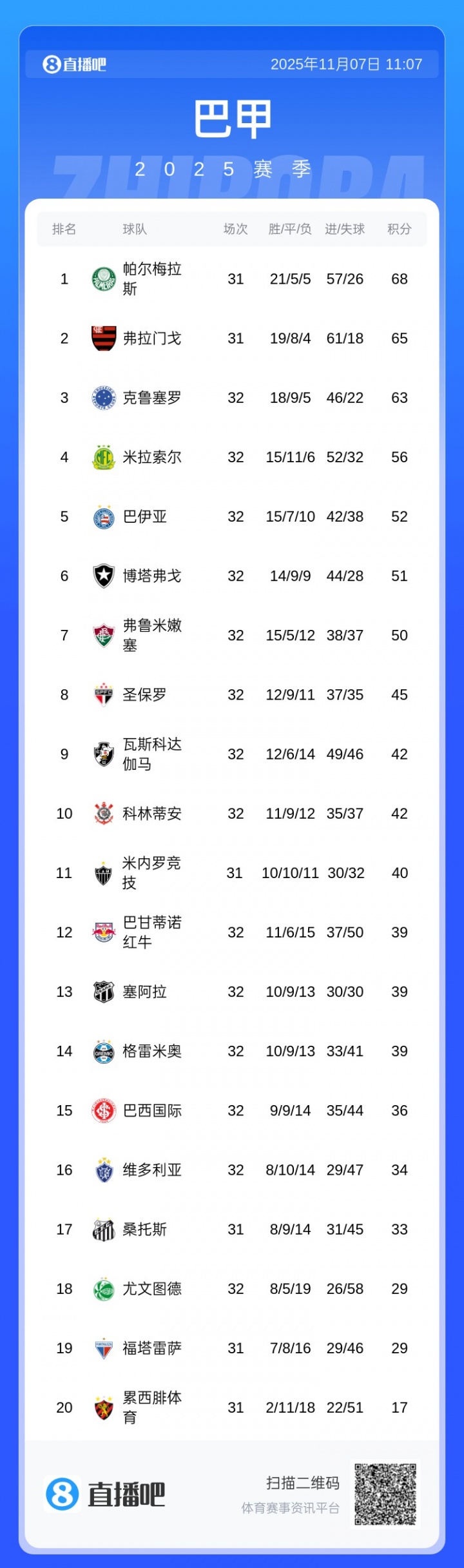 在目前的积分榜上,由于昨天维多利亚取得胜利,桑托斯的排名掉队第17位,身处降级区,帕尔梅拉斯则是凭借今天的胜利升至积分榜榜首。