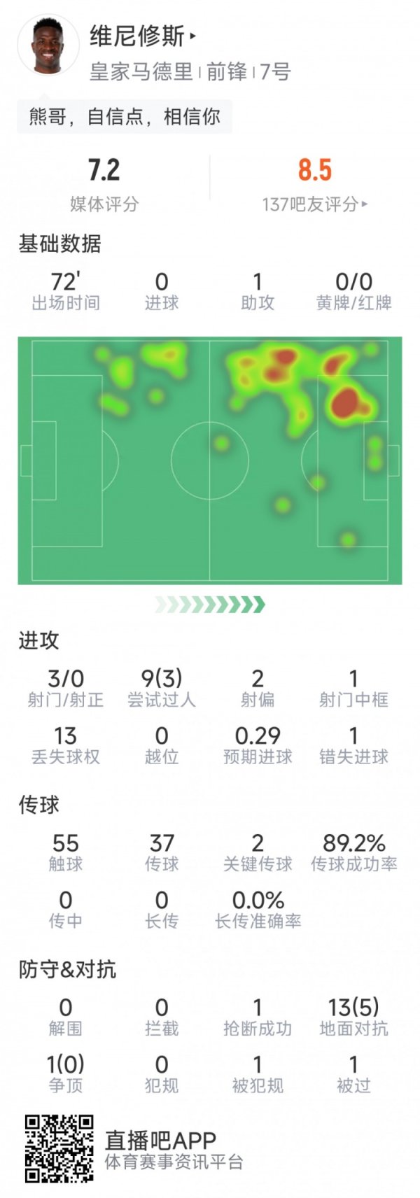维尼修斯本场数据:1次助攻,3射0正,1次中框,1次失良机足球大小球投注策略 9月21日讯 在本轮西甲皇马对阵西班牙人的比赛中,维尼修斯送出助攻,以下为他在本场数据: 比赛时间72分钟 1次助攻 3射0正 9次过人3次成功 1次中框 1次错失良机 55次触球 2次关键传球 传球成功率89% 14次对抗5次成功 评分7.2分足球大小球投注策略