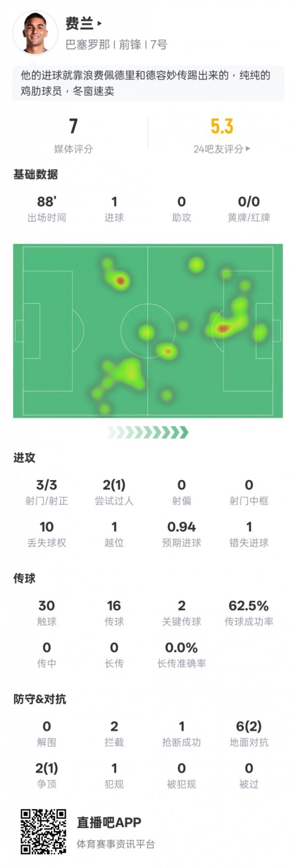 费兰本场数据:1进球2关键传球1过人成功1错失进球机会,评分7.0足球让球盘口解析 11月3日讯 西甲第11轮,巴萨主场迎战埃尔切,费兰-托雷斯首发出战,贡献1粒进球,送出2次关键传球,1次过人成功,1次错失进球机会,评分7.0。 费兰本场比赛数据: 进球1 助攻0 射门3 射正3 过人2足球让球盘口解析 过人成功1 丢失球权10 错失进球机会1 触球30 传球16 关键传球2 传球成功率62