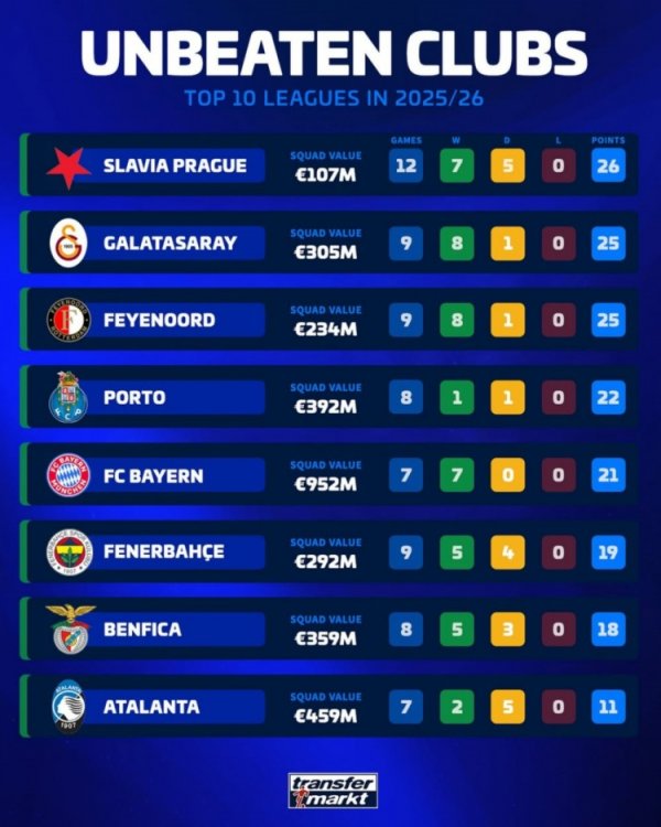 本赛季欧洲前十联赛8队保持不败,五大联赛仅剩拜仁、亚特兰大足球赛事赔率查询 10月25日讯 德转盘点了欧洲前十联赛目前仍保持不败的球队,共计8队,其中五大联赛仅剩拜仁、亚特兰大。具体如下: 布拉格斯拉维亚 12场7胜5平 加拉塔萨雷 9场8胜1平足球赛事赔率查询 费耶诺德 9场8胜1平 波尔图 8场7胜1平 拜仁 7场全胜 费内巴切 9场5胜4平 本菲卡 8场5胜3平 亚特兰大 7场2