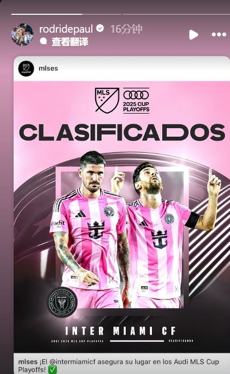 在社交媒体上,迈阿密国际新援德保罗晒出了迈阿密国际闯进季后赛的海报,以纪念这一特殊的时刻。