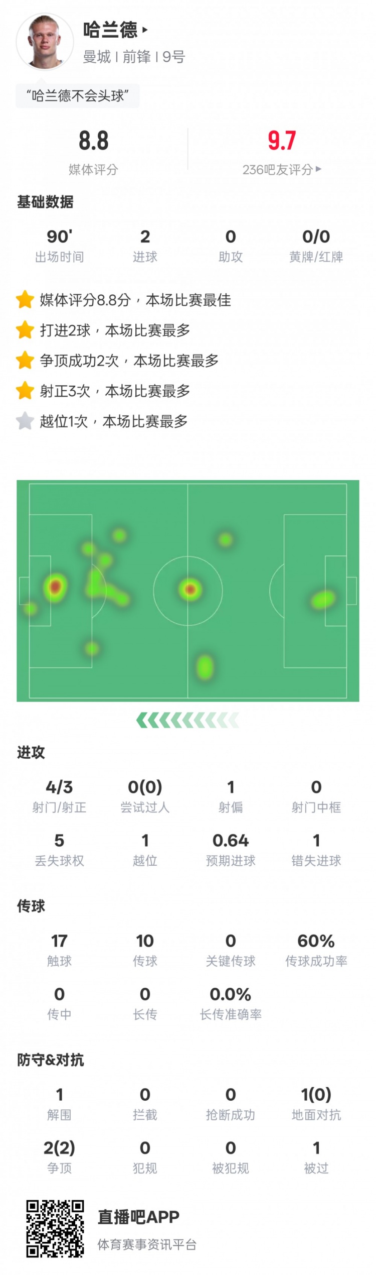10月2日讯 欧冠职业联赛 阶段第2轮,曼城客场应战 2-2摩纳哥,哈兰德杆位出战,英超直播4射球 3射正,打进2球,评分8.8全场最高。