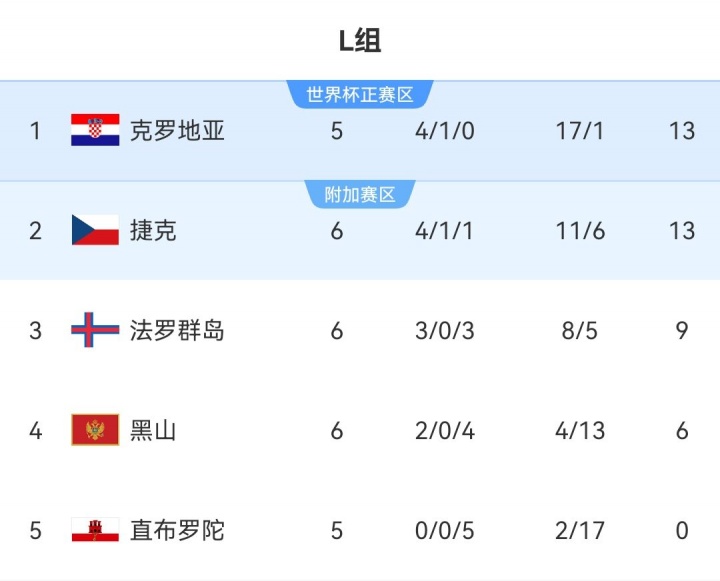 在目前的积分榜上,法罗群岛3胜3负排名小组第3,其中两场获胜 是在直布罗陀身上获得的。最后两轮赛事 他们将对阵小组前二克罗地亚和捷克,在首局 对阵这两支球队时,法罗群岛也只是1球落败。虽然几乎不可能在世界杯赛 上看到这个北欧群岛的身影,但还是可以期待他们能否带来更多惊喜。
