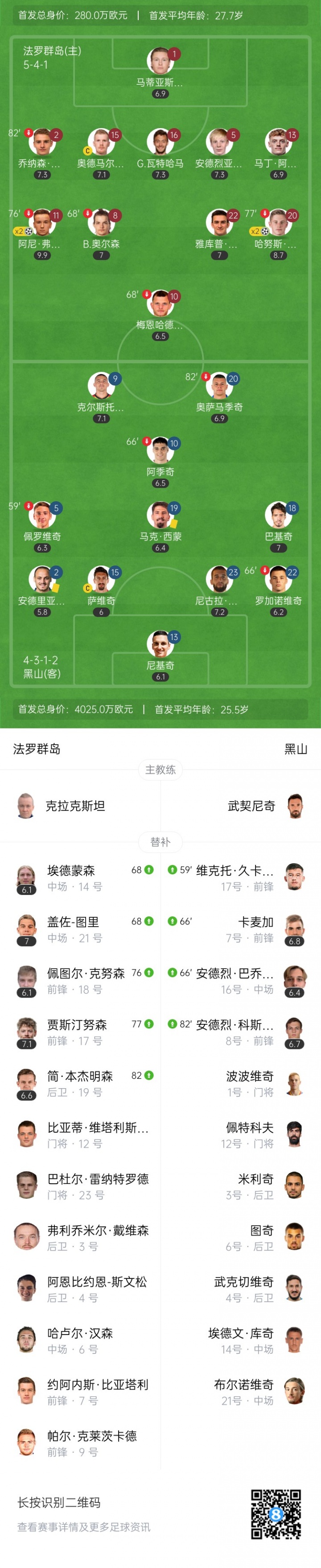 对比两队的阵形 ,英超免费高清直播法罗群岛的杆位11人身价仅280万,大部分球员都在本土职业联赛 效力;而黑山锋线坐拥两位在意甲效力的球员,亚特兰大的克尔斯托维奇和尤文的阿季奇,杆位11人身价4025万欧。