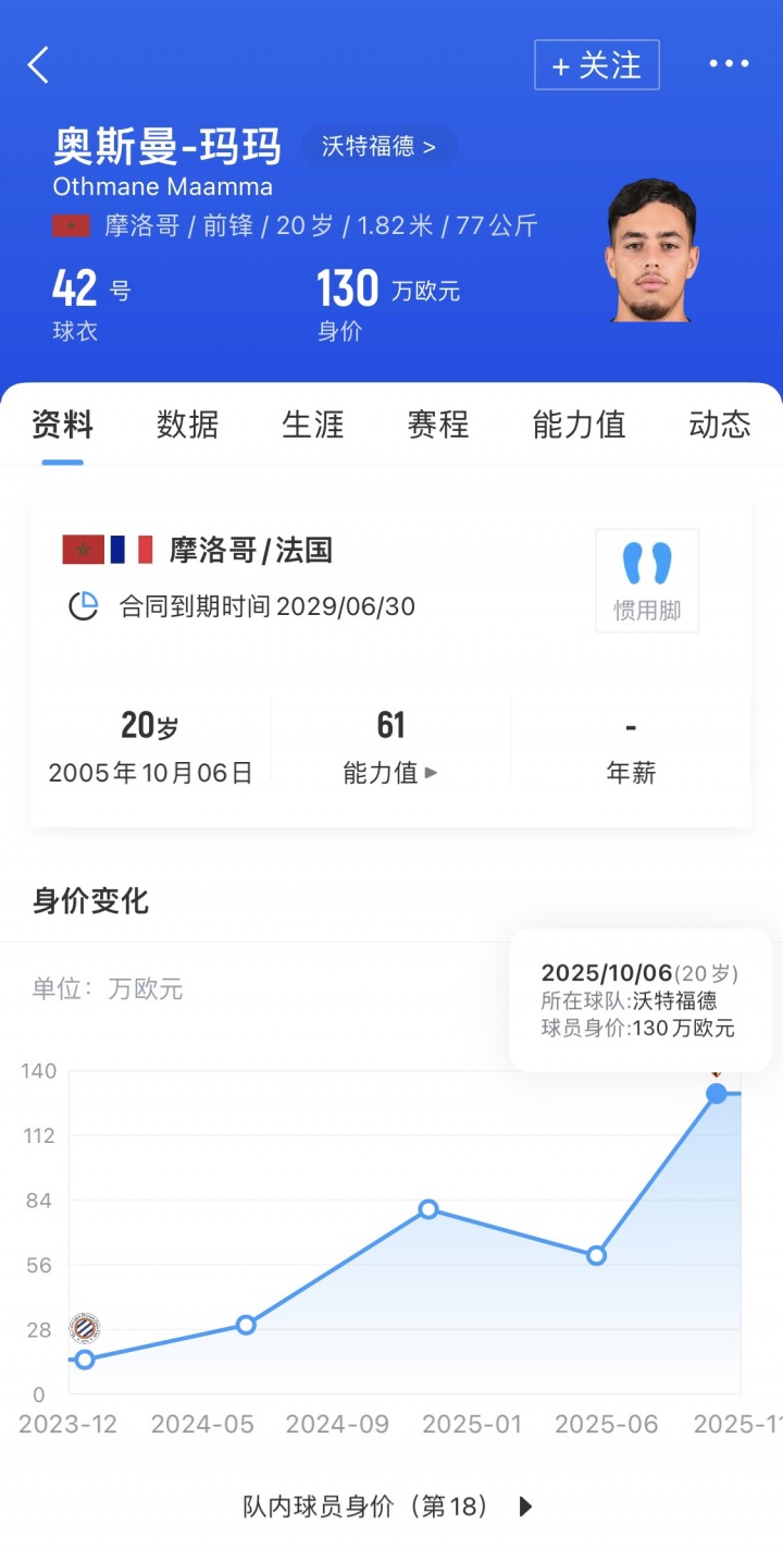 奥斯曼-玛玛目前身价130万欧。2024年晋升至蒙彼利埃一线队,参加14场赛事 ,打进2球并有1次助功 。今年夏窗,沃特福德以130万欧的价格签下了他,但球员尚未在英冠获得出场机会。
