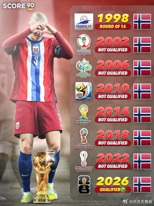 哈兰德和挪威队距离重返世界杯赛 总决赛 圈只是一步之遥了,英超直播在线高清(无插件)上一次他们在世界杯赛 亮相还是1998年。这个赛季都目前为止,“魔人布欧”各项赛事已经打进30球,他们会成为美加墨的爆冷体育选手 么?