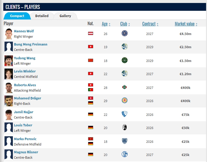 德转显示该公司目前旗下的部分球员: