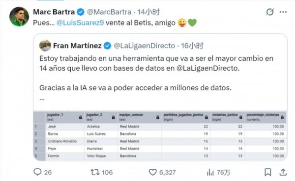 与苏牙西甲同时出场胜率100%,巴尔特拉调侃:来贝蒂斯吧,哥们足球比赛投注技巧 10月18日讯 据足球数据专家Fran Martínez统计,巴尔特拉、苏亚雷斯在巴萨共事期间一起出战19场西甲比赛,胜率100%。 目前效力于贝蒂斯的巴尔特拉在社交媒体上转发了这条动态,配文调侃:“那么…苏亚雷斯,来贝蒂斯吧,哥们。”