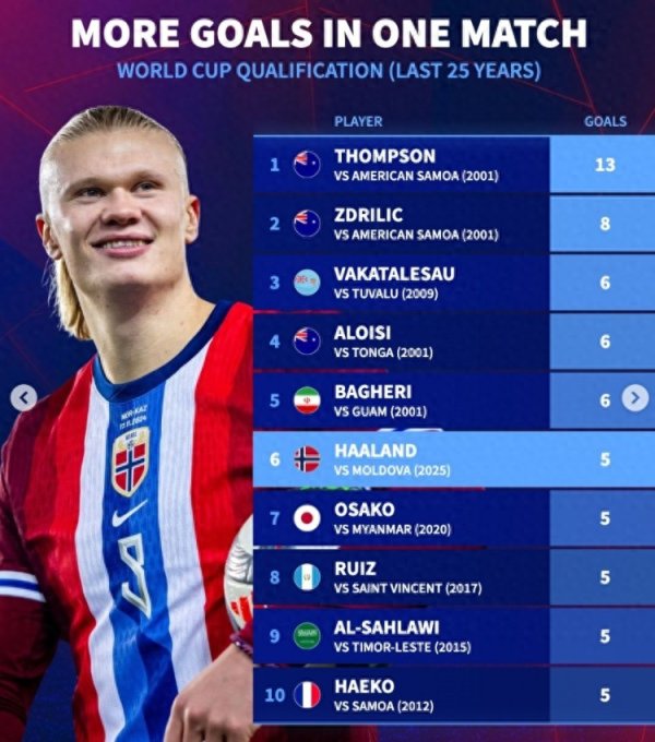 近25年世预赛单场射手榜: 最高记录 13球, 哈兰德5球并列第6直播吧9月10日讯 挪威在本轮世预赛11-1血洗摩尔多瓦,《转会市场》也统计了新世纪世预赛单场射手榜,前4名均出现在大洋洲世预赛。 近25年世预赛单场射手榜: 1.汤普森(澳大利亚),vs美属萨摩亚(2001),13球 2.兹德里利奇(澳大利亚),vs美属萨摩亚(2001),8球 3.瓦卡塔莱绍(斐济),vs图瓦卢(2009),