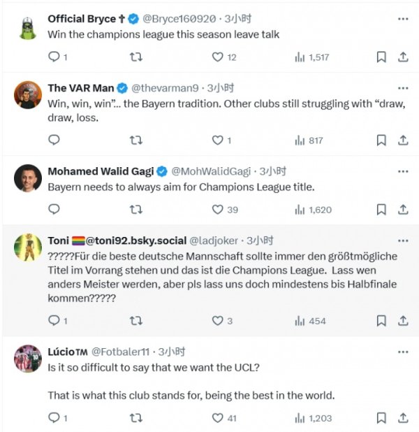 遭仁迷怒喷没野心!拜仁主席称赛季目标是男女足&篮球赛 队德甲夺魁09月04日讯 拜仁主席海纳接受媒体的采访,被问到了球队本赛季的目标,海纳谈到拜仁本赛季目标是男足+女足+篮球赛 队都赢得国内职业联赛 第一名 ,却只字未提欧冠,这遭到拜仁球迷怒喷。 球迷评论↓ “拜仁需要把欧冠第一名 作为目标” “说我们想成为欧冠第一名 就这么难吗?这才是我们俱乐部的宗旨:成为世界最佳” “闭嘴吧,你自己也说