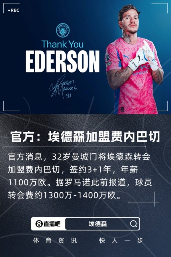 年薪1100万!官方:曼城守门员埃德森加盟费内巴切,转会费约1300万9月2日讯 官方消息,土超费内巴切正式签下曼城守门员埃德森。此前据罗马诺报道,转会费约1300万-1400万欧。 曼城官宣: 埃德森已永久转会至费内巴切,交易正等待国际转会许可。 祝埃德森未来职业生涯一切顺利。 费内巴切公告: 我俱乐部已与曼城就巴西守门员埃德森的转会事宜达成一致。球员已抵达伊斯坦布尔,以完成正式签约手续