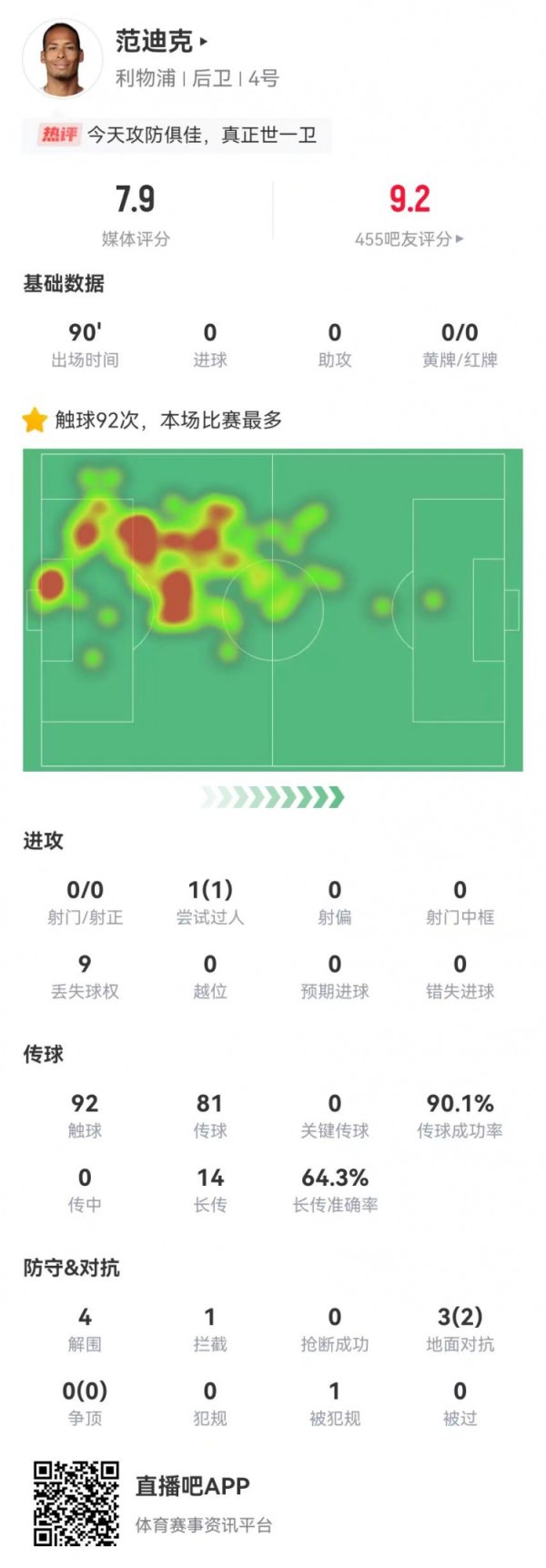 世几卫?范迪克4解围3封堵1拦截0被过0犯规 14长传9成功 获7.9分足球球员历史记录 9月1日讯 利物浦在本轮英超1-0绝杀阿森纳,范迪克本场数据如下: 首发踢满全场 4解围 3封堵 1拦截足球球员历史记录 0被过 0犯规 3对抗、2成功 9丢失球权 1造犯规 92触球 81传球、73成功,成功率90% 14长传、9成功 1过人、1成功 获评7.9分足球球员历史记录